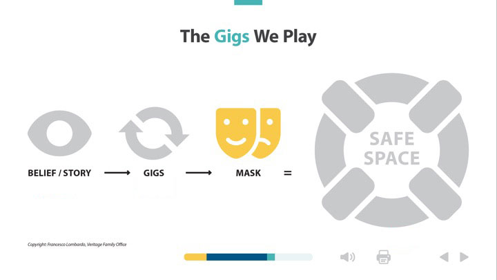 The gigs we play are our automatic trigger response and default behaviour under stress or when we feel vulnerable that we engage in to reassure or convince ourselves and give others the illusion of our being in control and operating out of our safe space. The mask we wear helps perpetuate the belief we have and continues to allow us to justify to ourselves, the gigs we play. In reality the mask we wear is part of the lie we tell ourselves to maintain our own illusion of safety. We cannot find and maintain the safe space we seek when we are still wearing a mask and performing our gigs.