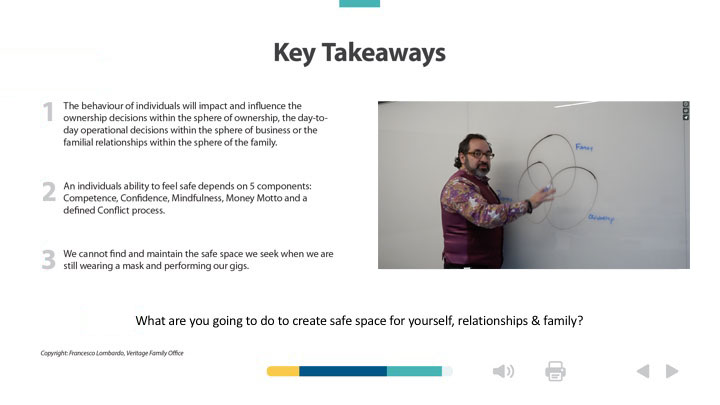 - An individuals ability to feel safe depends on 5 components: Competence, Confidence, Mindfulness, Money Motto and a defined Conflict process